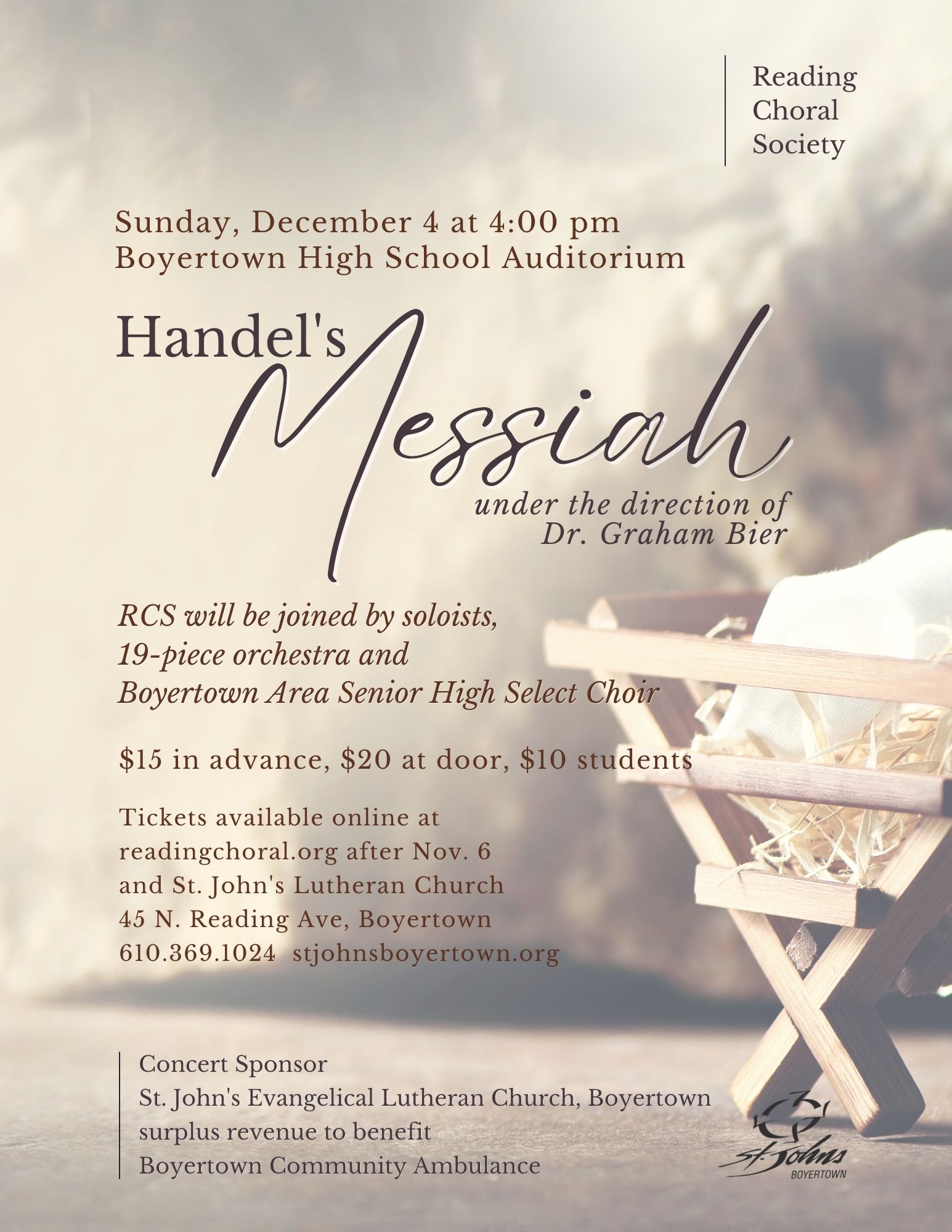 St. John’s Evangelical Lutheran Church, Boyertown is proud to sponsor the Reading Choral Society (RCS) in a performance of Handel’s Messiah, under the direction of Dr. Graham Bier, Music Director. The RCS will be accompanied by a nineteen-piece orchestra and the forty-five member Boyertown Senior High School Select Choir.